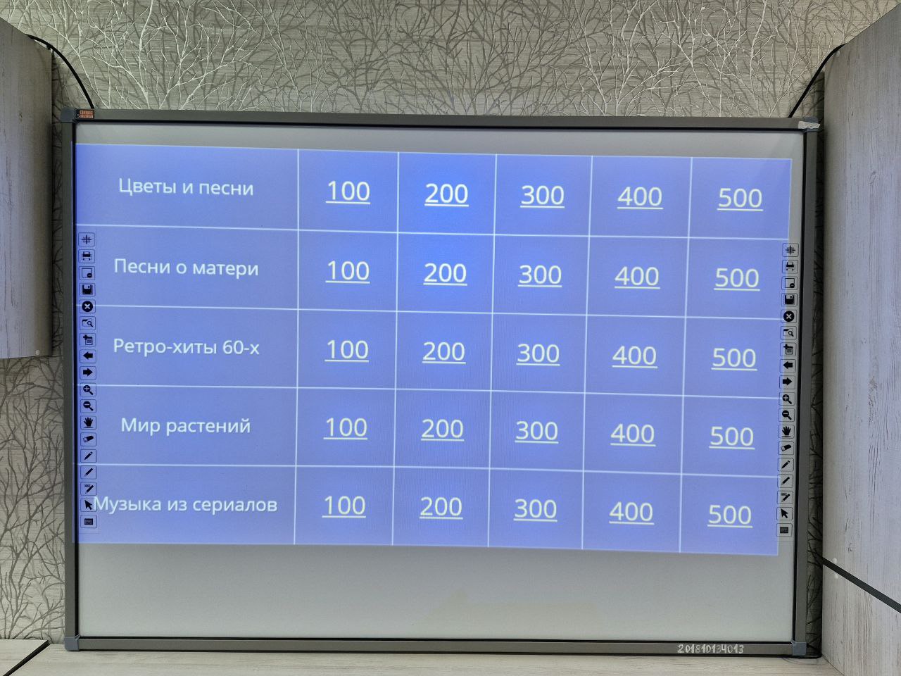 Мероприятие началось с пословиц, поговорок и стихов, посвященных матерям, и продолжилось интерактивной игрой «Своя игра», где необходимо было отгадать название песни среди пяти представленных тем: «Цветы и песни», «Песни о матери», «Ретро-хиты 60-х», «Мир растений» и «Музыка из сериалов». Вспомнили также и музыкальные заставки из любимых телевизионных передач, а конкурс танцев под знакомую мелодию вальса, танго и ламбады никого не оставил равнодушным.